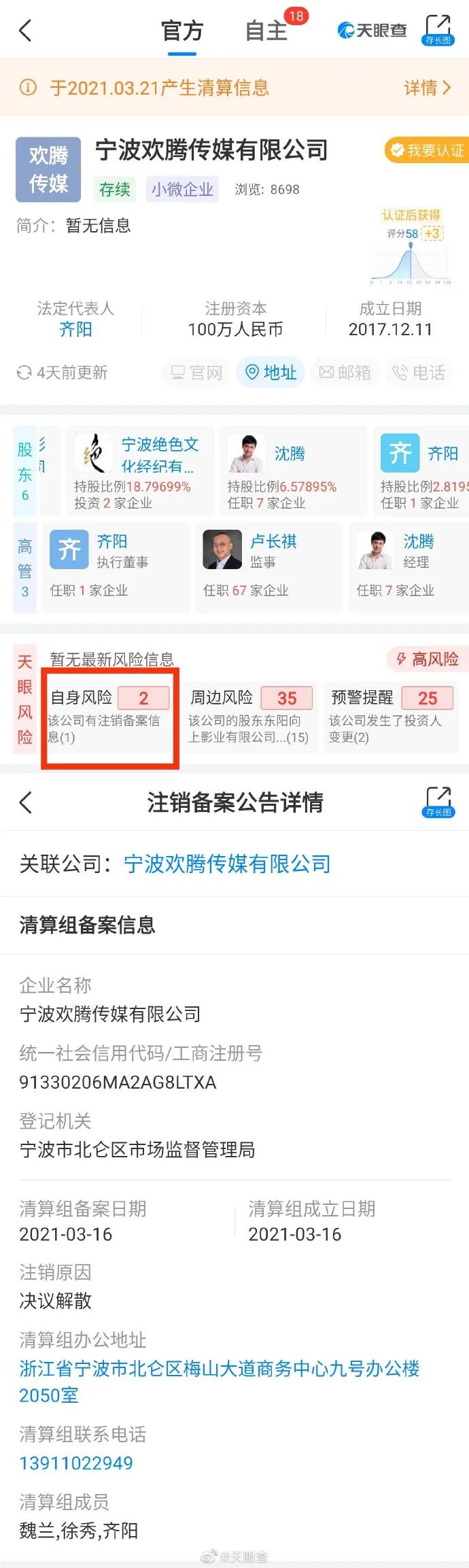 据天眼查APP显示,近期接连有明星关联公司注销,据不完全统计,涉及注销的名人如下:魏大勋、姚晨老公曹郁、何炅父亲、邓超、唐嫣、文章、马薇薇、那英(后撤销简易注销公告)、赵本山、朱正廷、孟美岐、吴宣仪、沈腾、井柏然、王千源。