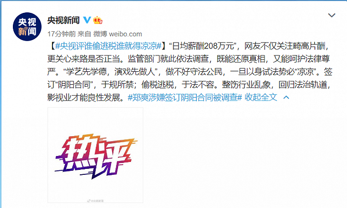 央视热评:谁偷逃税谁就得“凉凉”